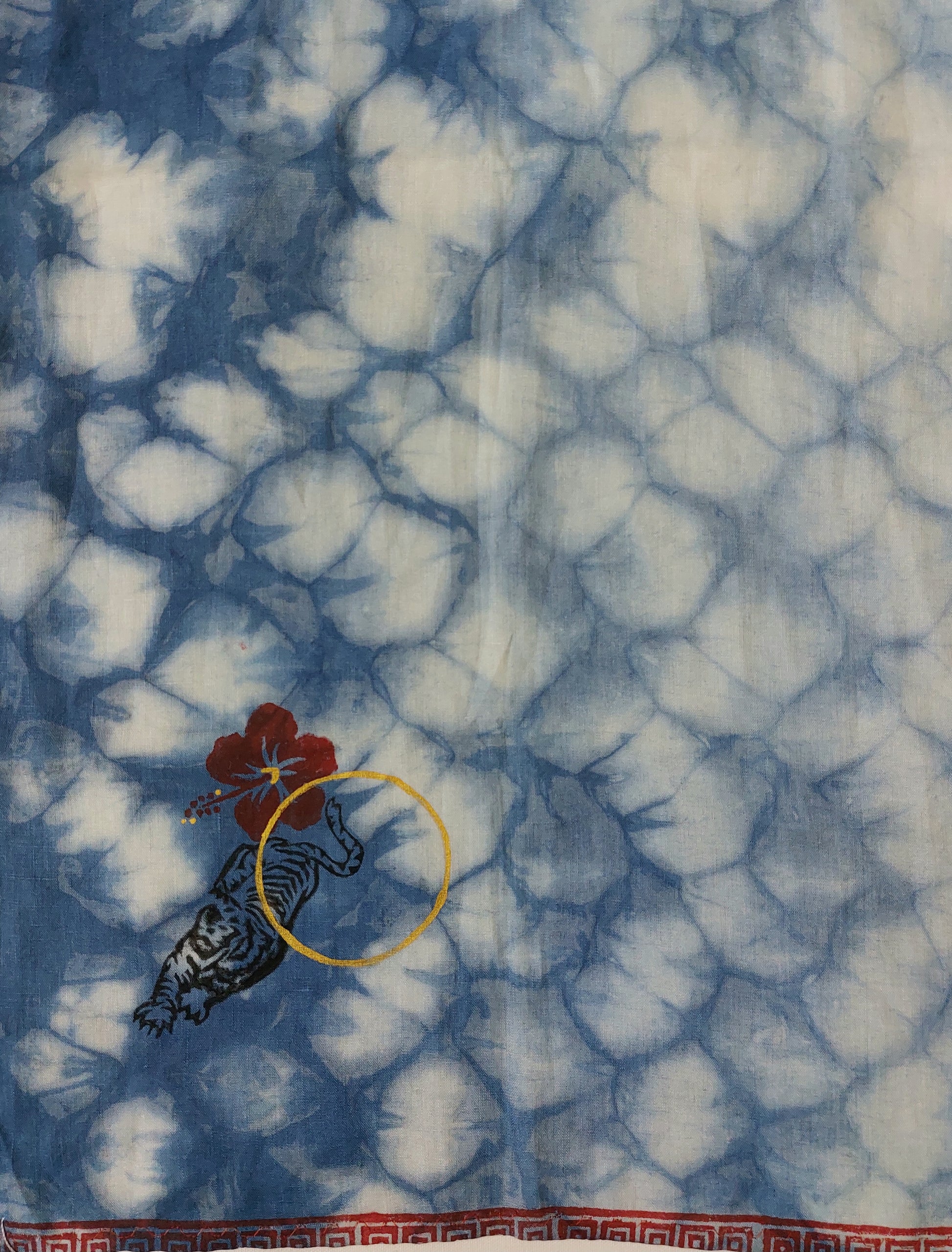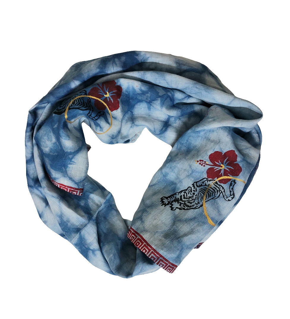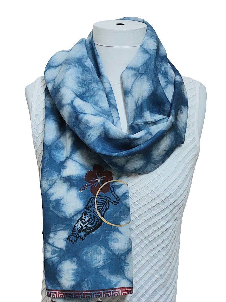 Shakti —Indiespiral's tribute to the Divine Feminine in all Her glorious forms. A limited edition silk and linen scarves to celebrate strength, beauty, and grace. The resist dyed patterns and motifs ( tiger, hibiscus, golden circle ) are symbolic of purity, power and protection. More than adornment, they are talismans—an offering to honor the spirit, energy, and infinite beauty of the Divine Feminine within and around us.