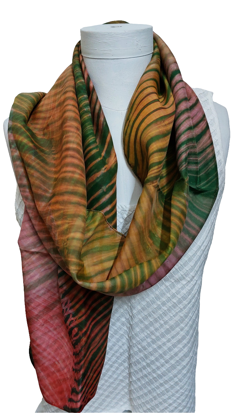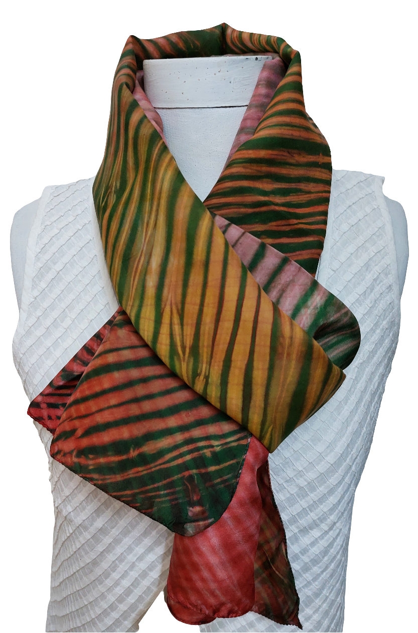 Luxurious Mulberry silk scarf dyed with onion skin, sappanwood, rhubarb using Aarashi shibori technique.