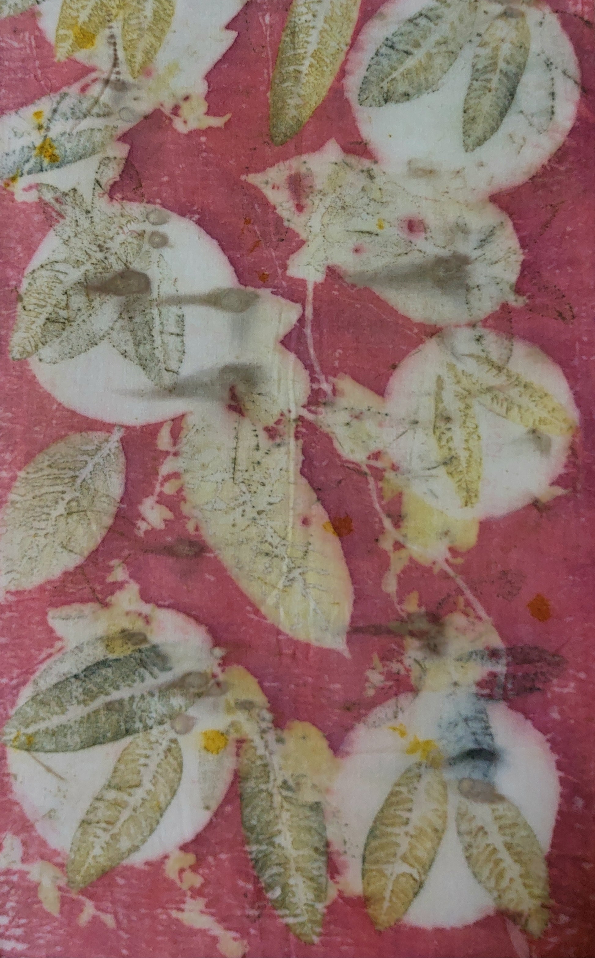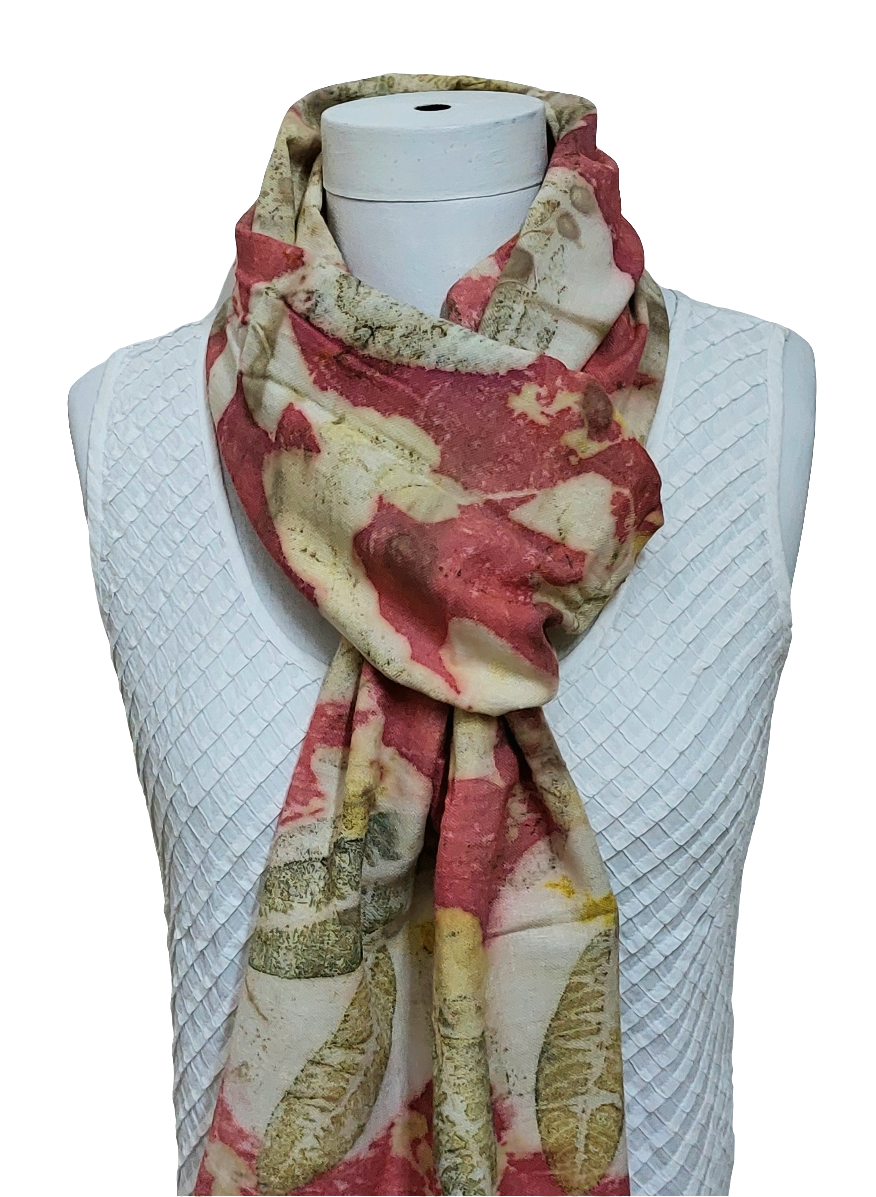 Luxurious Eri Silk scarf, handwoven in twill weave, eco printed with guava, geranium and local creeper leaves using madder dye
