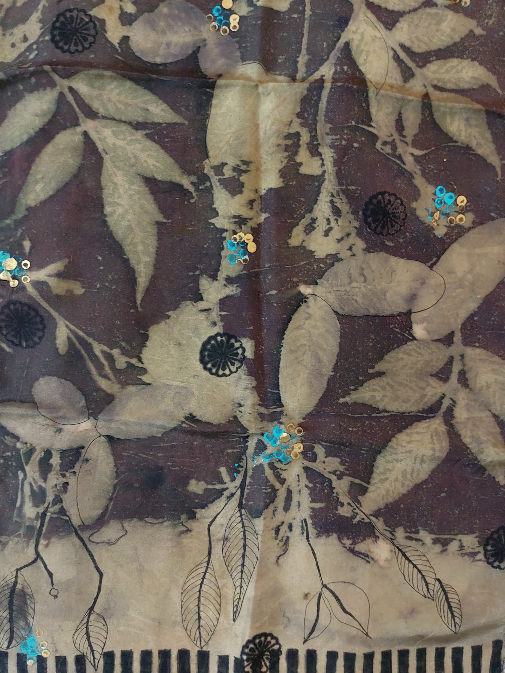 Luxurious Mulberry Silk scarf, eco printed with guava, peepal and wild creeper leaves, using myrobalan dye and iron, hand painted, block printed and subtly highlighted with gold.
