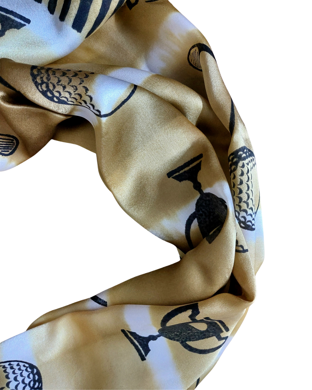 Luxurious Charmeuse silk scarf resist dyed with onion skins using itajime shibori technique, block printed with customized blocks and subtly highlighted with gold.